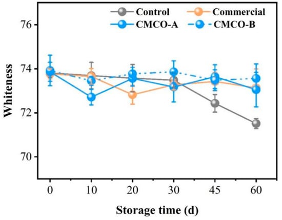 Decreased whiteness of gel products made from frozen surimi is a common problem impairing their appearance and edible qualities. As depicted in Figure 8, the whiteness value of the control group kept decreasing from 0 to 60 days. As expected, the addition of cryoprotectants could limit the loss of whiteness of surimi gels, whose values of CMCO-A, -B, and commercial group experienced no significant difference during the entire storage period. Similar phenomenon was also reported by Tao and Walayat [5,8] who attributed the decline of gel whiteness to the combined effects of nonenzymatic protein oxidation and crystallization-induced protein denaturation. The addition of oligosaccharides could prevent those protein deteriorations and thus maintain the whiteness of gels prepared from frozen surimi [50].