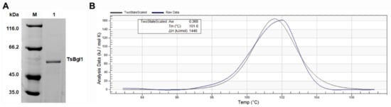 β-glucosidase TsBgl1 was successfully expressed in the expression host B. subtilis WS11. The recombinant enzyme solution was purified by ammonium sulfate fractional precipitation and Ni2+ affinity chromatography (as shown in Table S2). An obvious single band with a theoretical molecular weight of TsBgl1 was shown in the SDS-PAGE blot (Figure 1A). The results of differential scanning calorimeter (DSC) analysis showed that the melting temperature (Tm) of recombinant TsBgl1 was 101.5 °C (Figure 1B), which indicated its high thermostability.