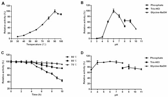 Enzymatic properties of recombinant TsBgl1. (A) effect of temperature on enzyme activity. (B) effect of pH on enzyme activity. (C) thermostability. (D) pH stability. The data of pH stability was shown as the residual enzyme activities measured under optimal conditions of enzymes incubated in buffers of different pH values at 4 °C for seven days. The activity assays were performed using 4 mM pNP-β-Glc as substrate.
