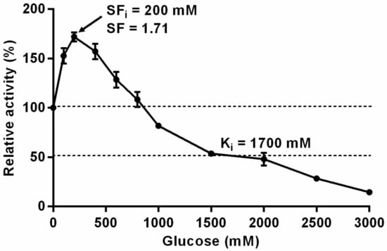 As shown in Table 1, among all determined substrates, TsBgl1 showed the highest specific activity and catalytic efficiency on pNP-β-Glc. Moreover, TsBgl1 had significantly higher specific activity and catalytic efficiency on laminaribiose than other disaccharides. In terms of substrate affinity, the Km value of TsBgl1 on gentiobiose and sophorose were the highest, indicating that higher substrate concentration was needed for the effective hydrolysis of these two disaccharide substrates. It was well known that the activity of many β-glucosidase could be competitively inhibited by glucose. The decrease of the catalytic activity of β-glucosidase caused by this inhibition may greatly limit the application of β-glucosidase. The results of glucose tolerance analysis of recombinant TsBgl1 showed that, when the glucose concentration was in the range of 0–900 mM, the activity of TsBgl1 was higher than that without glucose (Figure 3). The maximum activity was observed at a glucose concentration of 200 mM and the stimulating factor (SF) was 1.71. When the concentration of glucose was higher than 900 mM, the activity began to be inhibited by glucose and decreased gradually. The inhibition constant (Ki), which represents the concentration of inhibitor needed to reduce the enzyme activity to half of the maximum activity, was 1.72 M. Several thermostable and glucose tolerant β-glucosidases have been found in recent years. A novel GH1 β-glucosidase BglM identified from a hot-spring metagenome showed good thermal stability and remained at 80% relative activity at 1 M glucose concentration [25]. Moreover, the GH3 β-glucosidase produced by Malbranchea pulchella (MpBgl3) was reported to be not inhibited by 1 M glucose [26]. Recently, a research group of Amit Ghosh has proved that the presence of glucose binding sites and the accompanying conformational changes was responsible for the uncompetitive inhibition and high tolerance of GH1 β-glucosidase (H0HC94) from Agrobacterium tumefaciens 5A [27,28].