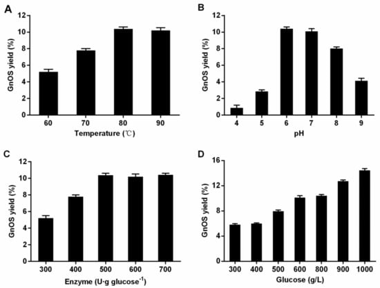 In this study, the optimal conditions for the preparation of GnOS catalyzed by TsBgl1 were studied in the aspects of temperature, pH, amount of enzyme and substrate concentration (Figure 4). As the solubility of glucose in water increases with the increase of reaction temperature, high temperature can ensure the complete dissolution of the high concentration substrate in the system and reduce the solution viscosity. So, temperature is an important parameter affecting the preparation of GnOS catalyzed by TsBgl1. The results showed that the yield of GnOS reached the highest value at 80 °C, and the yield changed little with a further increase of temperature, which may be due to the relative poor thermostability of TsBgl1 at 90 °C and the decrease of enzyme activity in the later stage of the reaction. Then the reaction was carried out at 80 °C to explore the effect of different pH values on the yield of GnOS. When pH was below 6.0, the yield increased with the increase of pH, reaching the highest value under pH 6.0, and then decreased with the increase of pH. Furthermore, The balance between the activity of transglycosylation and hydrolysis of the enzyme was another key factor to determine the yield of GnOS. Too little enzyme will lead to low transglycosylation reaction activity and a low GnOS synthesis rate, while too much enzyme will lead to enhanced hydrolysis and secondary hydrolysis of the product which might terminate the GnOS accumulation. The experimental results showed that GnOS reached the highest yield when the amount of TsBgl1 was 500 U·g glucose−1. Moreover, the yield of GnOS remained basically unchanged when the amount of enzyme increased, indicating that the activity of transglycosylation and hydrolysis reached a balance at this dosage. Because a high concentration of glucose can competitively inhibit the hydrolytic activity of the enzyme and significantly reduce the water activity, the effect of substrate concentration on the yield of GnOS is also very important. In this study, the reaction was carried out with 300–1000 g·L−1 glucose as substrates at 80 °C and pH 6.0. The results showed that the yield of GnOS increased with the increase of glucose concentration. When the substrate concentration is 800 g·L−1 glucose, the yield of GnOS was 10.41%. Moreover, when the substrate concentration was increased to 1000 g·L−1, the yield of GnOS reached the highest value of 14.43%.