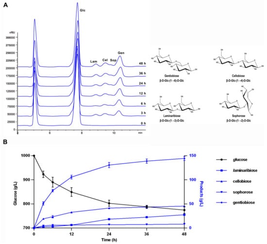 Transglycosylation product analysis of recombinant TsBgl1. (A) HPLC chromatograms of transglycosylation products and formulas of the disaccharides synthetized by TsBgl1. Lam, laminaribiose (Glc-β-1,3-Glc). Cel, cellobiose (Glc-β-1,4-Glc). Sop, sophorose (Glc-β-1,2-Glc). Gen, gentiobiose (Glc-β-1,6-Glc). The formulas of the disaccharides were shown in the boat conformation, and the position of the linked hydroxyl group from the non-reducing end to the reducing end were annotated by arrow. (B) Time course of TsBgl1 catalyzed transglycosylation. The reaction was performed by adding 500 U·g glucose−1 TsBgl1 and using 1000 g·L−1 glucose as substrates at 80 °C and pH 6.0.