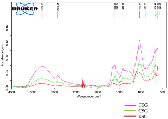 FTIR spectra of the FSG (Flaxseed byproduct gum), CSG (Chia seed byproduct gum), and RSG (Rocket seed byproduct gum) in the spectral region between 400 and 4000 cm−1.