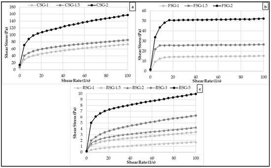 Steady shear rheological properties of the FSG (flaxseed byproduct gum), CSG (chia seed byproduct gum), and RSG (rocket seed byproduct gum) solutions with different concentrations ((a) CSG (1–2%), (b) FSG (1–2%), (c) RSG (1–5%)).