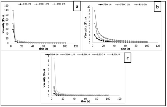 The viscosity of CSG: chia seed byproduct gum, FSG: flaxseed byproduct gum, RSG: rocket seed byproduct gum solutions with different concentrations ((a) CSG (1–2%), (b) FSG (1–2%), (c) RSG (1–5%)).