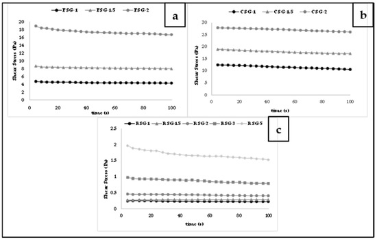 Shear stress vs. time at a constant shear rate (0.5 s−1) for CSG: chia seed byproduct gum, FSG: flaxseed byproduct gum, RSG: rocket seed byproduct gum solutions with different concentrations ((a) CSG (1–2%), (b) FSG (1–2%), (c) RSG (1–5%)).
