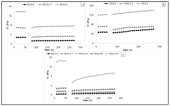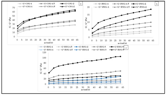 Viscoelastic behavior of the (a): CSG: chia seed byproduct gum (1–2%), (b): FSG: flaxseed byproduct gum (1–2%), (c): RSG: rocket seed byproduct gum (1–5%) solutions with different concentrations.