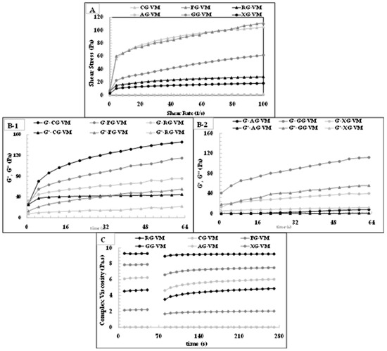Rheological properties of vegan mayonnaise samples formulated with different gums. FG-VM: flaxseed oil byproduct gum vegan mayonnaise, CG-VM: chia seed oil byproduct gum vegan mayonnaise, RG-VM: rocket seed oil by-product gum vegan mayonnaise, GG-VM: guar gum vegan mayonnaise, XG-VM: xanthan gum vegan mayonnaise, AG-VM: gum Arabic vegan mayonnaise. (A) Steady shear rheological properties of the low-fat vegan mayonnaise samples, (B-1) Viscoelastic behavior of the low-fat vegan mayonnaise samples formulated with CG, FG, and RG, (B-2) Viscoelastic behavior of the low-fat vegan mayonnaise samples formulated with AG, GG, and XG, (C) 3-ITT rheological properties of the low-fat vegan mayonnaise samples.