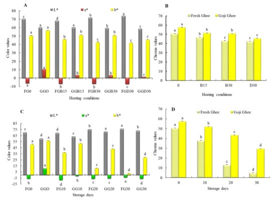 Color values of FG0 and GG0 (A). Changes in L*a*b* of FG0 and GG0 during MW-heating; (B). Chroma values of FG0 and GG0 during MW-heating; (C). changes in L*a*b* of FG0 and GG0 during accelerated storage; (D). Chroma values of FG0 and GG0 during accelerated storage (Figure 1B,C). The labels 0, B15, B30, and D30 represent color values at zero and the MW temperatures 180 °C (15 and 30 min) and 200 °C for 30 min, respectively. Error bars represent the standard deviation (sd) of the mean value (n = 3). “a, b, c, d” indicate significant differences within individual ghee treatments at p < 0.05.