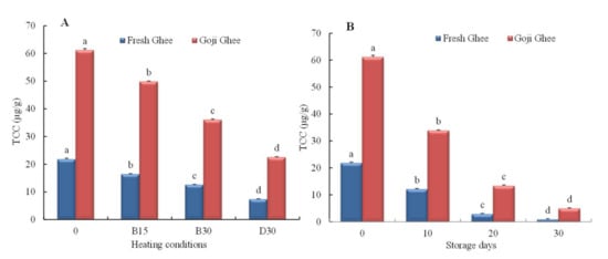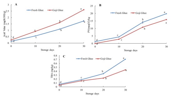 In this study, the AV, PV, and TBA of FG0 were 0.14 mgKOH/g, 1.24 meqO2/kg, and 0.07 mg/kg, respectively (Figure 3). While there were no peroxides in GG0, the initial AV and TBA values were 0.1 mgKOH/g and 0.04 mg/kg, respectively. In addition, MW-heating significantly increased these parameters after each heating condition, as presented in Figure 3 (p < 0.05). The AV, PV, and TBA of FG0 increased to maximum values of 0.41 mgKOH/g, 9.80 meqO2/kg, and 0.23 mg/kg, respectively. While the AV, PV, and TBA of GG0 increased to 0.24 mgKOH/g, 3.89 meqO2/kg, and 0.12 mg/kg, respectively. As presented in Figure 4, accelerated storage showed a similar but increased trend to that of MW-heating in FFA and in the oxidative stability parameters. The AV, PV, and TBA of FG0 increased to 1.73 mgKOH/g, 19.84 meqO2/kg, and 0.71 mg/kg, respectively, after 30 days of storage. While the AV, PV, and TBA of GG0 increased to 0.88 mg KOH/g, 15.94 meqO2/kg, and 0.44 mg/kg, respectively, after 30 days of storage. One-way ANOVA showed that these increments were statistically significant for every 10 days of storage (p < 0.05). These results indicate that incorporation of goji berry carotenoids into yak ghee produced more stable yak ghee than the control. Furthermore, MW-heating and accelerated storage had a more degrading effect on the oxidative stability of FGO than it did on that of GG0. Ultimately, this study showed that enriching yak ghee with goji berry carotenoids inhibited the production of peroxides, MDA, and free fatty acids. This effect is mainly due to increased levels of the carotenoid antioxidants such as zeaxanthin that the goji berries probably enriched in GG0.