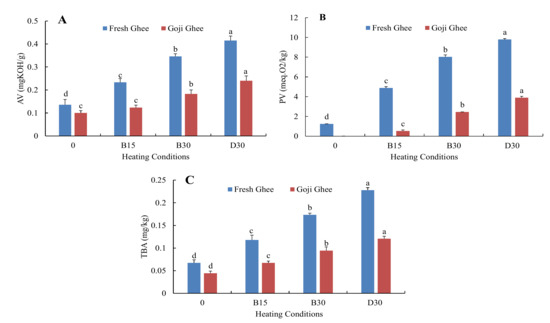 The acid value (AV) is a critical indicator of the free fatty acid content resulting from the hydrolytic breakdown of the triglycerides (TAGs) in the ghee and indicates the extent of deterioration (rancidity) resulting from poor storage or processing conditions [46]. In lipid hydrolysis, lipases catalytically cleave off the three fatty acids from the glycerol backbone of unsaturated fatty acids (UFA) during the second stage of lipid oxidation. High levels of these FFA, especially short-chain free fatty acids, result in the butter demonstrating rancidity and off-flavors that are unacceptable to consumers [47]. However, the peroxide value (PV) measures the concentration of primary oxidation products (peroxides) that serve as an integral marker of lipid oxidation in ghee. At the initial stages of lipid oxidation, peroxides are produced from UFA reactions with molecular oxygen [48]. Furthermore, TBA (TBARs) measures malondialdehyde (MDA) mg as well as other reactive substances such as 2-alkenals and 2,4-alkadienals in 1 kg of a substance. MDA (α,β-unsaturated aldehydes) is the most abundant aldehyde produced together with ketones, epoxides, hydroxy compounds, oligomers, and polymers from the oxidation of the lipid peroxides formed from primary oxidation when exposed to oxygen. These secondary oxidation products are what give oxidized products their distinctive off-flavors [46,49].