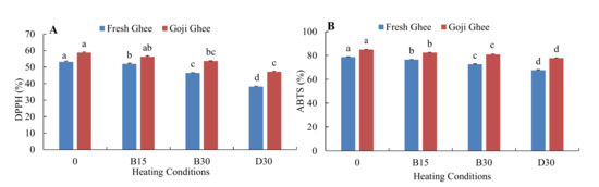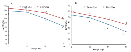 Changes in the radical scavenging activities of FG0 and GG0 during accelerated storage. (A). ABTS values; (B). DPPH values. Error bars represent the standard deviation (sd) of the mean value (n = 3). “a, b, c, d” indicate significant differences within individual ghee treatments at p < 0.05.