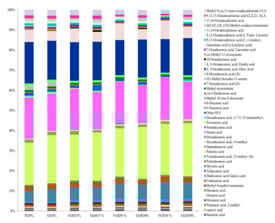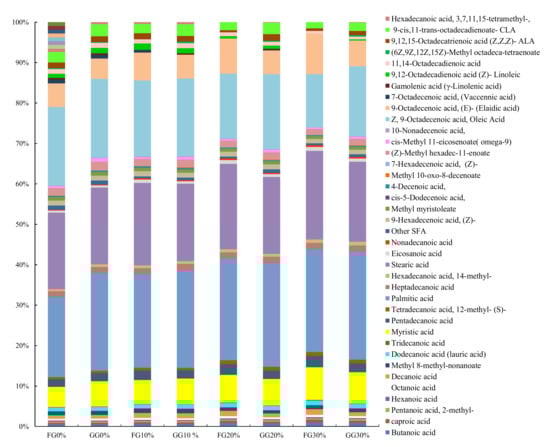 Changes in fatty acid profiles in FG0 and GG0 during accelerated storage. The labels 0, 10, 20, and 30 attached to FG and GG represent the storage days of raw yak ghee and goji berry carotenoid-enriched yak ghee.