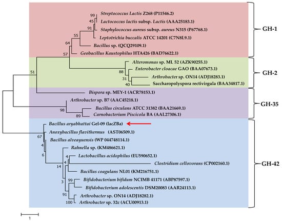 Evolutionary tree of β-galactosidases AA sequences based on the maximum likelihood (ML) method. Bootstrap values were expressed as a percentage of 500 replicates. The position of lacZBa in the phylogenetic tree was marked by the red arrow.