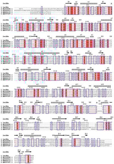 BLAST analysis showed that lacZBa had the highest similarity (99.85%) with β-galactosidase (WP_182028680.1) of Bacillus sp. ME75. To verify the phylogenetic position of lacZBa among the characterized β-galactosidases, we used the maximum likelihood method to construct a phylogenetic tree of lacZBa and 24 β-galactosidases, which have been reported from different glycoside hydrolases (GH) families (Figure 1). The results showed that lacZBa was in clade 42, formed from GH-42 (Figure 1), whereas clade 1, clade 2, and clade 35 were formed by β-galactosidases from GH-1, GH-2, and GH-35, respectively. Moreover, lacZBa had different sequence identity with β-galactosidases from Bacillus alveayuensis, Anoxybacillus flavithermus, Bacillus coagulans NC01, and Lactobacillus acidophilus, exhibiting 72.4%, 68.2%, 26.7%, and 24.3% identities, respectively. lacZBa was considered a new member of the GH-42. Sequence and phylogenetic analyses indicated that each GH family appeared to be genealogically related to each other through a separate gene lineage, because the four families are distantly related to each other [35]. In addition, we used multiple sequence alignment to compare lacZBa with other related GH-42 β-galactosidase from different bacteria, and the conserved sequence and catalytic domain were further analyzed (Figure 2). The results showed that GH-42 β-galactosidase had conserved amino acid residues and a catalytic domain. β-galactosidases from the four families belonged to the GH superfamily A and had a typical (β/α)8-barrel structure. Members of the GH-42 cleave glycosidic bonds via retaining mechanisms, in which the product maintained the same conformation as the original substrate. Two glutamate or aspartic acid residues played an important role in catalysis; one acted as an acid-base catalyst, and the other acted as a nucleophilic reagent. The catalytic process consisted of a two-step double substitution mechanism [36].