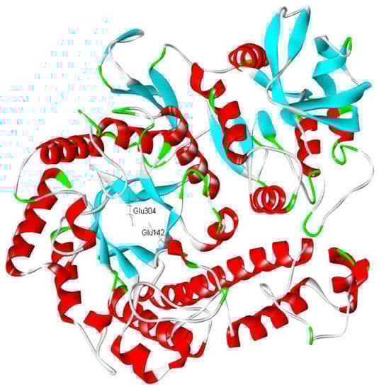 The crystal structure of β-galactosidase (PDB 3tts.1) from Bacillus circulans sp. alkalophilus was used as the template to simulate the lacZBa structure. Moreover, the ramachandran plots of the structure was also analyzed (Figure S1). The predicted 3D structure of lacZBa fit well with the typical (β/α)8 TIM barrel scaffold. Two conserved catalytic residues Glu142 and Glu304 were observed in the substrate binding pocket in the TIM barrel of lacZBa (Figure 3), which were similar to Glu141 and Glu312 of β-galactosidases from Thermotoga naphthophila RUK-10 [37] and T. thermophilus A4. β-galactosidase A4-β-Gal from T. thermophilus A4 is one of the thermostable members of GH-42, and it is the first GH-42 enzyme to have its crystal structure determined. A4-β-Gal possesses a (β/α)8 TIM barrel structure [17].