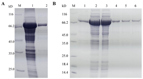 To investigate its biochemical properties, we expressed lacZBa in E. coli BL21(DE3). Cells were cultured in LB medium for 6–8 h, and seeded into TB medium at 5% (v/v) inoculum. The cells were induced by adding 0.2 mmol/L IPTG after 3 h of incubation in TB medium, and continued to be cultured for 36 h. After fermentation, the optical density (OD600) reached 22.14. Additionally, there was significant lacZBa activity in the recombinant cell lysates. Because lacZBa is an intracellular enzyme, the recombinant cells were disrupted by ultrasonic treatment, and the soluble protein fractions of the lysed cells were collected as crude enzyme. The crude enzyme was purified by ammonium sulfate precipitation and dialysis following DEAE-μSphere anion-exchange chromatography (Table 1). SDS-PAGE analysis showed that the subunit molecular mass of the purified protein was ~75 kDa (Figure 4). By comparison, most β-galactosidases belonging to the same GH family had a similar number of AA residues. Most members of GH-42 contain more than 600 AA residues in each monomer. For example, B. bifidum NCIMB 41171 [38] β-galactosidase contains 689 AA residues, B. coagulans β-galactosidase contains 665 AA residues, and B. aryabhattai Gel-09 β-galactosidase (lacZBa) contains 649 AA residues. Members of GH-2 contain more AA residues than those of GH-42, including β-galactosidase from Saccharopolyspora rectivirgula [39] (1251 AA residues), β-galactosidase from Alteromonas sp. ML52 [40] (1059 AA residues), and β-galactosidase from Enterobacter cloacae GAO [41] (1028 AA residues). β-galactosidases from GH-35 and GH-1 contain a smaller number of AA residues. β-galactosidase from Bacillus circulans (GH-35) contains 586 AA residues, while β-galactosidase from Leptotrichia buccalis ATCC 14201 (GH-1) [42] only has 467 AA residues, and its subunit molecular mass is ~53 kDa.