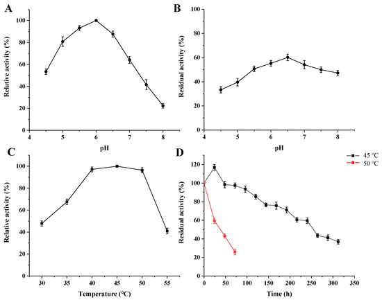 Figure 5A shows that lacZBa had its highest activity at pH 6.0, with >60% of its maximum activity at pH 5.0–7.0. However, its activity decreased sharply at pH > 7.0. In addition, lacZBa was stable at pH 5.5–7.0 and retained more than 50% activity following incubation at pH 5.5–7.0 for 24 h (Figure 5B). Therefore, lacZBa is suitable for applications in neutral or weakly acidic conditions, which are suitable for lactose hydrolysis in milk (pH 6.0–7.0) [43].