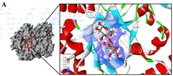 In addition, molecular docking was used to analyze the interaction between lactose and catalytic residues (Glu142 and Glu304). The carboxyl groups of Glu142 and Glu304 located on the hydrophilic face of the glucose residue and hydrophobic face of the galactose residue, respectively. Based on multiple sequence alignment (Figure 2) and molecular docking analysis (Figure 6B), Glu142 probably acted as the nucleophile (bases), and Glu304 likely acted as the proton donor (acids).