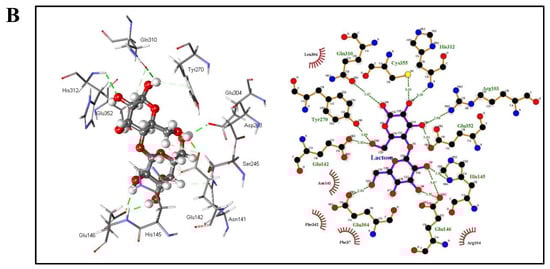 Lactose was docked into the substrate binding pocket of lacZBa to generate the binding mode. The docking results revealed that lactose binds to the active site pocket of lacZBa (Figure 6A). To reveal the substrate recognition mechanisms, substrate–enzyme interaction analyses was performed. We assayed the hydrogen bonding networks and hydrophobic interactions at the enzyme active pocket (Figure 6B). Ten AA residues (Arg103, Glu142, His145, Glu146, Tyr270, Glu304, Gln310, His312, Glu352, and Cys355) formed 11 hydrogen bonds with lactose. There were hydrophobic interactions between lactose and residues Phe37, Arg104, Asn141, Leu306, and Phe342. These results showed that lacZBa has a strong lactose binding ability, which is beneficial to substrate hydrolysis. There were one hydrophobic interaction and seven H-bonds for glucose residues and three hydrophobic interactions and four H-bonds for galactose residues (Figure 6B). The binding energy between lacZBa and lactose was −105.3052 kcal/mol, which was lower than that of the binding energy (−93.5294 kcal/mol) between B. circulans (PDB: 3tts.1) and lactose.