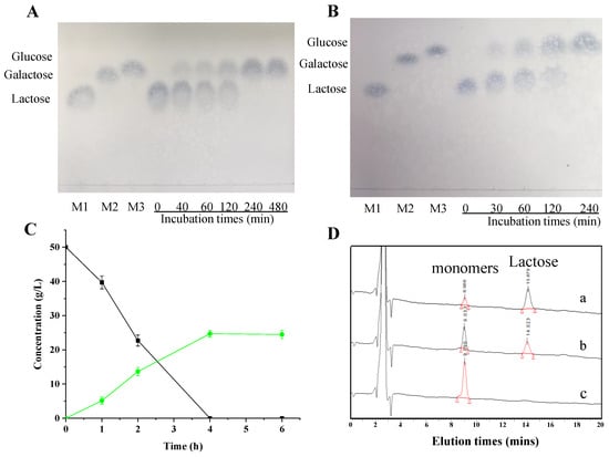 To determine the lactose hydrolysis ability of lacZBa, 8 U/mL lacZBa was used to hydrolyze a 50 g/L lactose solution. The hydrolytic products of lacZBa were analyzed by TLC. The results showed that lactose could be completely hydrolyzed by lacZBa within 4 h (Figure 7A). To further investigate the application performance of lacZBa, we used commercial milk. We mixed 8 U/mL lacZBa with commercial skim milk, and samples were taken at different time periods. After deproteinization of commercial milk samples with 10% trichloroacetic acid at 4 °C for 3 h, we measured the hydrolytic products by TLC, glucose biosensor and HPLC. As shown in Figure 7B, lactose in commercial milk was completely hydrolyzed within 4 h, indicating that lacZBa was sufficient. Lactose in commercial milk was progressively hydrolyzed as the reaction progressed, and 54.58% lactose was hydrolyzed in the first 2 h (Figure 7C). Lactose was completely hydrolyzed by lacZBa when the reaction time was extended to 4 h (Figure 7C,D). However, no galactooligosaccharides (GOS) was detected during the hydrolysis process.