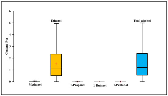 Alcohols, particularly ethanol, are important volatile components of fermented foods, responsible for imparting a unique flavor and aroma [32]. A wide range (0–4.99%) was noticed in the alcohol content and proportions of the tested gochujang products. The mean total alcohol content was 1.58 ± 1.28% (Figure 1 and Supplementary Table S1). Among the tested alcohols (methanol, propanol, butanol, and pentanol), ethanol content was the highest, ranging from 0 to 4.9%. Therefore, ethanol represented the single major contributor to the total alcohol content of gochujang products (Figure 1 and Supplementary Table S1). The mean ethanol content of the gochujang products was 1.53 ± 1.23%, whereas the mean methanol content was 0.004 ± 0.005% (Figure 1).