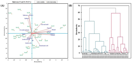 Principal component analysis (A) and agglomerative hierarchical clustering analysis (B) of 35 different gochujang products from the traditional cottage industry.