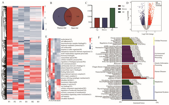 mRNA analysis of muscles from pasture-fed and barn-fed black goats. (A) Hierarchical cluster analysis of genes identified in the pasture-fed and barn-fed group. (B) Number of genes expressed in the two groups. (C) Number of differentially expressed genes. (D) Distribution of the genes expressed in the two groups, red dots and blue dots indicate genes significantly up-regulated or down-regulated in the barn-fed group. (E) GO Enrichment analysis of the differentially expressed genes. (F) KEGG analysis of the differentially expressed genes.
