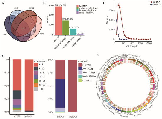 Identification of lncRNAs in goat muscles. (A) Prediction method Venn diagram. (B) Sta-tistics of the number of four different types of lncRNAs. (C) ORF length distribution of mRNA and lncRNA. (D) Statistical of exon number and length. (E) Distribution of the identified lncRNA and mRNA in the chromosome.