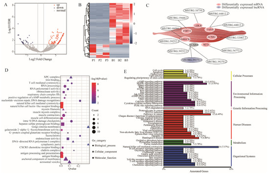 Differential expression and enrichment analysis of lncRNAs. (A) Differentially expressed lncRNAs in the muscles. (B) Cluster diagram of differentially expressed lncRNA. (C) Relationship between lncRNAs and the target genes. (D) GO analysis of biological process, molecular function and cell components of differentially expressed lncRNA CIS target genes among samples. (E) Classification of differentially expressed lncRNA CIS target gene KEGG.