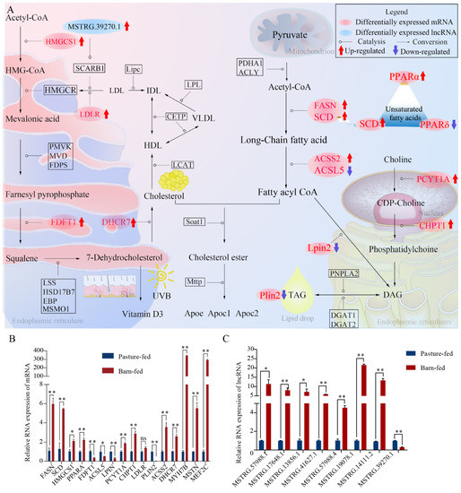 Analysis of the underlying molecular mechanism and qRT-PCR analysis of the differentially expressed genes and lncRNAs. (A) Analysis of the underlying molecular mechanism of the two feeding models. Genes and lncRNAs in red or blue indicate the differentially expressed genes or lncRNAs identified in this study; arrows in red or blue indicate up-regulated or down-regulated in the barn-fed group. (B) qRT-PCR analysis of the differentially expressed mRNA. (C) qRT-PCR analysis of the differentially expressed lncRNA. * and ** indicate significant different (p < 0.05 or p < 0.01).