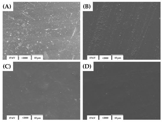 The SEM micrographs of the zein-based solvent-cast materials: plain film (A) and films incorporating 10 (B), 20 (C), and 30% (D) of the sage extract.
