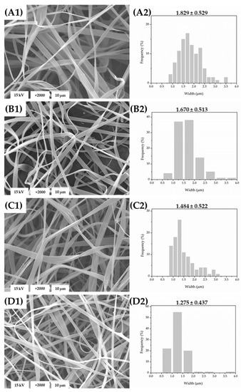 The SEM micrographs of the zein-based electrospun materials (A1,B1,C1,D1) and the width distribution histograms (A2,B2,C2,D2): plain mat (A) and mats incorporating 10 (B), 20 (C), and 30% (D) of the sage extract.