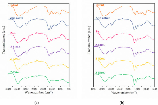 The spectrum of the matrix in its native form, before processing, showed characteristic bands for zein at 3319 cm−1 (N-H and O–H stretching vibrations, amide A), 1657 cm−1 (C=O stretching vibrations, amide I), and 1533 cm−1 (N-H bending and C–N stretching vibrations, amide II). Other bands were observed at 2961 cm−1 (C–H stretching vibrations), 1449 cm−1 (NH3+ symmetric deformations), and 1239 cm−1 (C–N axial deformation vibrations, amide III) [18,33,45]. The spectra of the solvent-cast film and the electrospun mat without the incorporated extract also exhibited these characteristic bands for zein. However, the applied techniques influenced the zein spectrum. In the case of the plain film, there were some spectral changes in the bands’ positions compared to the native zein. Namely, the positions of the bands related to amide A and amide I were shifted to 3418 and 1645 cm−1, respectively. On the other hand, there were no significant variations in the bands’ positions on the plain mat and the native zein spectra. These observations indicate the existence of different molecular structures in the solvent-cast and the electrospun materials in addition to the previously discussed morphological differences. The reason for this may be the much slower rate of solvent evaporation during the materials’ fabrication by solvent casting, rather than by electrospinning. Thus, intramolecular interactions between the biopolymer chains are more probable during solvent casting.