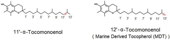 Chemical structure of 11′-α-tocomonoenol (11′-αT1) and 12′-α-tocomonoenol (also known as marine-derived tocopherol (MDT); 12′-αT1) [18,19].
