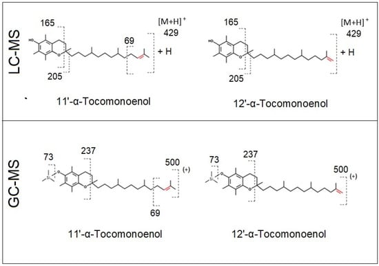 Expected fragmentation patterns of 11′-α-tocomonoenol (11′-αT1) and 12′-α-tocomonoenol (12′-αT1) using LC-MS (upper panel) [40,41] and GC-MS after silylation (lower panel) [29,41].