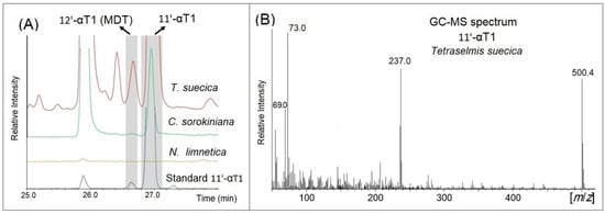 This is in agreement with results from GC-MS analysis finding a predominant signal corresponding to the retention time and fragmentation pattern of 11′-αT1, not 12′-αT1 (Figure 3A). The corresponding predominant peak at 27.0 min of the GC-MS chromatogram featured the characteristic signals of molecular (m/z 500) and tropylium ions (m/z 237) of 11′-αT1 [29] along with m/z 69, which is associated with a double bond between positions 11′ and 12′ [41] (Figure 3B). This is in agreement with the pattern of isolated 11′-αT1 and was found in all analyzed microalgae samples. These data confirmed and extended our previous findings that 11′-αT1 was present in cultured microalgae, namely Tetraselmis sp., Chlorella vulgaris, and Nannochloropsis oceanica [32].