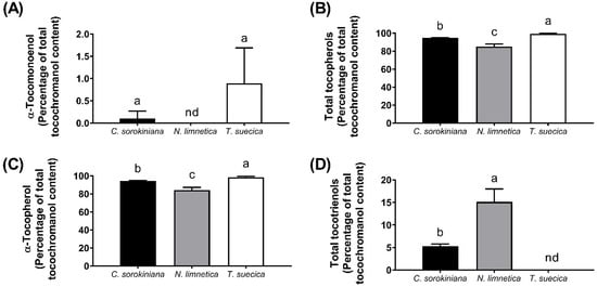 α-Tocomonoenol (αT1) (A), total tocopherols (T) (B), α-tocopherol (αT) (C), and total tocotrienols (T3) (D) content expressed as percentage of total tocochromanol content for Chlorella sorokiniana, Nannochloropsis limnetica, and Tetraselmis suecica, as determined by HPLC-FLD. Values are presented as arithmetic mean ± standard deviation (n = 6). Bars not sharing a superscript letter are significantly different (ANOVA, α = 0.05). Bars with “nd” refer to congeners not detected by HPLC-FLD.
