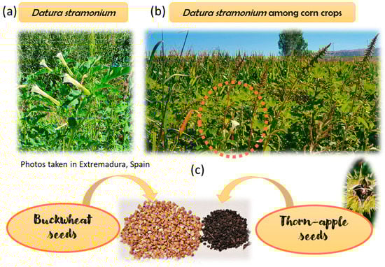 Contaminated cereals, pseudo-cereals, legumes and grains are of particular importance because these kinds of food-products are a major part of the diet for all age groups in the population. In relation to TAs’ occurrence, one of the most studied has been buckwheat (Fagopyron esculentum L.). In fact, this pseudo-cereal has caused great commercial interest for its healthy properties, being rich in polyphenols, vitamins and proteins [12]. Buckwheat flour and other gluten-free flours (i.e., amaranth, chickpea, pea, corn, rice, millet and quinoa flours, among others) are used as wheat flour substitutes in the production of gluten-free bread, cakes, cookies, pasta and snacks. These gluten-free foods have gained great popularity in the last years, not only in the celiac community, which emphasizes the need to carefully control the occurrence of TAs present in these products. This is of especial importance as the seeds of Datura stramonium are very similar in size and shape to those of buckwheat and other seed matrices such as linseed, soy, sorghum, and millet (Figure 1c). Additionally, the commercialization of organic foods is common so that the use of phytosanitary products is avoided, which results in the crops growing with a greater number of weeds. This can cause the contamination of the flours and derived products such as pasta, bread or baby foods, which are currently highly consumed.