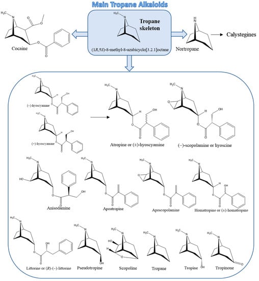 TAs are a type of alkaloids with a tropane ring in their chemical structure, characterized by a two-ringed structure with pyrrolidine and piperidine rings sharing a single nitrogen atom and two carbon atoms (Figure 2). Most of them are esters derived from organic acids and hydroxytropanes [2]. The most important TAs in foods are At, which is a racemic mixture of (±)-hyoscyamine, and (−)-Sc or hyoscine. Although cocaine and calystegines have also a tropane ring (Figure 2), so they can be included in the TAs group, these compounds will not be discussed in this review. Cocaine and other coca alkaloids from Erythoxylum coca have no interest in food analysis, as they are used as a drug of abuse. Calystegines are recently discovered polyhydroxylated nortropane alkaloids. Due to their inability to pass the blood–brain barrier, these compounds do not show any psychoactive effects and, until now, their occurrence and analysis in food samples have received little research attention [7].
