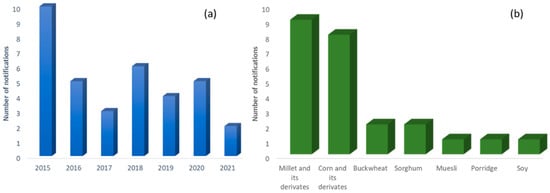 (a) Total number of notifications per year on the RAFSS portal and (b) number of notifications in the “cereals and bakery products” category from 2015 to 2021.
