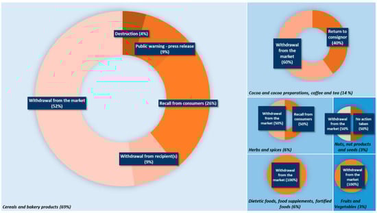 On the other hand, as it can be seen in Figure 3a, from 2015 to today, 35 notifications on TAs have been reported on the RASFF portal [20], 24 of them being in the category of the “cereals and bakery products” (Figure 3b). Eight different countries, Austria, Croatia, Czech Republic, France, Germany, Hungary, the Netherlands and the United Kingdom, have reported the appearance of At and Sc in different foods. Some of these products are imported from different European countries (see Table S1 in Supplementary Materials). The highest number of notifications were seen in the “cereals and bakery products” category, with 69% of the notifications; followed by the “cocoa and cocoa preparations, coffee and tea” category with 14% of the notifications; the “dietetic foods, foods supplements and fortified foods” and “herbs and spices” categories with 6% of notifications; and, finally, the “nuts, nuts products and seeds” and “fruits and vegetables” with 3%. The main action taken after the notification, in all the food categories, was withdrawal from the market (Figure 4).
