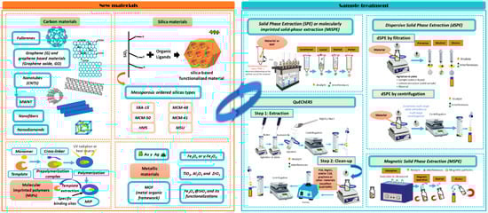 Currently, the application of new materials in the food sample treatment for the analysis of organic compounds is having a great impact [47]. This is due to the new materials having advanced textural properties, including high surface area, large pore volume, controllable particle size and morphology, well-defined pore-size distribution, controllable wall composition and functionalization and excellent chemical, thermal and mechanical stability, among others, making them suitable sorbents for sample preparation. The most common materials are polymer-based materials such as the MIPs, OMSs; carbon-based materials such as graphene (G), graphene oxide (GO) and carbon nanotubes (CNTs); or metallic-based materials such as magnetic nanoparticles (MNPs) and metal-organic frameworks (MOFs). All these materials can be applied as sorbents in different sample treatment protocols such as SPE, dispersive SPE (dSPE), QuEChERS, molecularly imprinted SPE (MISPE), magnetic SPE (MSPE), etc. (Figure 5).
