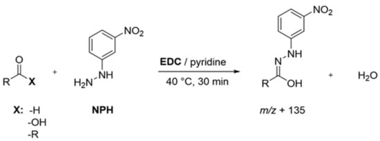 Sample Preparation: Following literature protocols, with slight modifications to analyze short and branched fatty acids [24] as well as aldehydes, ketones, and organic acids [15,16], protein isolates (40 mg) were first suspended in a mixture of acetonitrile/water (960 µL, 50:50, v/v), spiked with the IS solution (20 µL), and equilibrated overnight at room temperature under continuous shaking. After at least 20 h, the suspensions were mixed with a solution (20 µL, 200 mmol/L) of 3-NPH in acetonitrile/water (50:50, v/v) and a solution (20 µL, 120 mmol/L) of EDC in acetonitrile/water (50:50, v/v) containing 6% pyridine and derivatized for 30 min at 40 °C (Figure 1). A membrane-filtered (Minisart RC 15, 0.45 µm, Sartorius AG, Göttingen, Germany) aliquot (1 µL) was then analyzed via UHPLC-MS/MS (MRM transitions see Table S1).