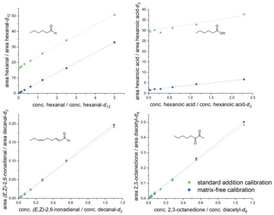 Certain examples (hexanal, hexanoic acid, (E,Z)-2,6-nonadienal, 2,3-octanedione) of matrix calibration curves (standard addition calibration) in a suspended pea protein (C) solution, in comparison to matrix-free calibration in acetonitrile/water (50:50, v/v).