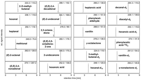 To guarantee fast, selective, and sensitive quantitation of 3-NPH tagged odorants by means of UHPLC-MS/MS, reference solutions were initially derivatized and used for software-assisted ramping of ion source and ion path parameters by syringe infusion [15,16]. The comparison of retention times and MS spectra could confirm the presence of 2- and 3-methylbutanal, hexanal, heptanal, methional, (E)-2-octenal, (E,E)-2,4-nonadienal, (E,Z)-2,6-nonadienal, (E,E)-2,4-decadienal, (E)-2-undecenal, (E)-2-dodecenal, 2,3-octanedione, (E,E)-3,5-octadien-2-one, 2-undecanone, hexanoic acid, heptanoic acid, phenylacetaldehyde, 4-ethyl benzaldehyde, vanillin, and γ-octalactone within one single run of nine minutes (Figure 3, for MRM transitions see Table S1).