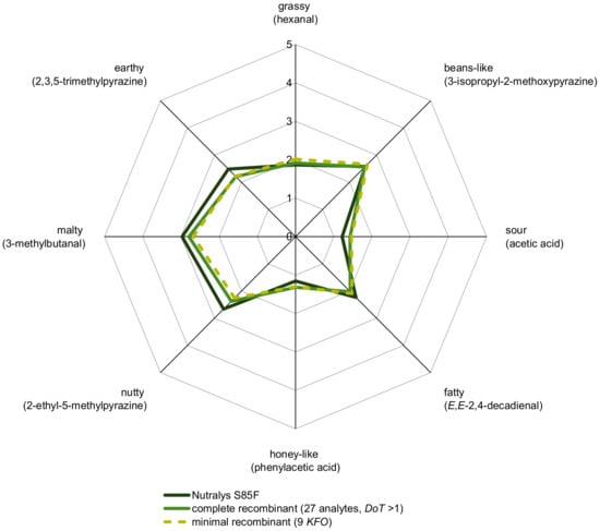 The first experiments revealed that an omission of all aroma-active compounds with OAV < 10 (test O1) did not lead to a significant difference (p > 5%), indicating minor importance of hexanoic, octanoic, phenylacetic, and 2-methylbutanoic acids as well as γ-octalactone, 2,3-octanedione, 2-undecanone, acetoin, and (E,E)-3,5-octadien-2-one for the overall aroma of pea protein C. In addition, the omission of the group of odorants with OAV < 100 (test O2: methional, vanillin, acetic, 3-methylbutanoic, and decanoic acids) could not be significantly (p > 5%) distinguished by the panel. For OAV > 100, all 13 odorants were individually omitted and tested against the complete recombinants, whereupon two odorants, namely 3-methylbutanal (OAV 10186, test O3) and heptanal (OAV 217, test O12), led to very highly significant differences (p < 0.1%). The omission of 2-methylbutanal (OAV 178, test O13) caused a highly significant difference (1% ≥ p < 0.1%), while omissions of hexanal (OAV 6202, test O4), acetaldehyde (OAV 4512, test O5), (E,E)-2,4-nonadienal (OAV 1157, test O8), (E)-2-octenal (OAV 533, test O9), benzaldehyde (OAV 248, test O11), and nonanoic acid (OAV 107, test O15) still led to significant differences (5% ≥ p > 1%). In contrast, omissions of (E,E)-2,4-decadienal (OAV 3741, test O6), phenylacetaldehyde (OAV 1173, test O7), and diacetyl (OAV 329, test O10) as well as (E)-2-undecenal (OAV 158, test O14) resulted in no significant differences (p > 5%) and, consequently, together with the odorants of OAV < 100, were considered as no KFO. Finally, a minimal recombinant based on these nine analytes (Figure 4) highlighted very high similarity compared to the complete recombinant consisting of 27 odorants with OAV > 1 (Table 3) and is underlining once more their role as KFO and importance on the overall aroma of pea protein C.