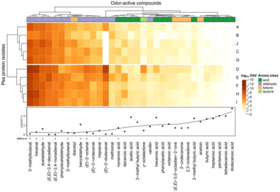 In summary, OAV heatmapping highlighted comparable influences on the overall aroma of pea proteins and emphasized the group of aldehydes. Moreover, there were strong indications that the examined KFO of pea protein C were transferable as general KFO among different pea proteins (Pisum sativum L.).
