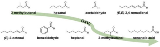 Odor thresholds were taken from the Leibniz-LSB@TUM odorant database or determined in water for 2,3-octanedione, (E,E)-3,5-octadien-2-one, and (E)-2-dodecenal according to literature [28,29].