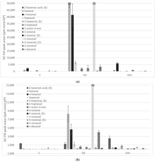 | 1003 | n-octanal | 56 ± 9 c | 475 ± 112 a | 106 ± 8 b | 31 ± 7 c | 2473 ± 1962 a | 902 ± 112 b |